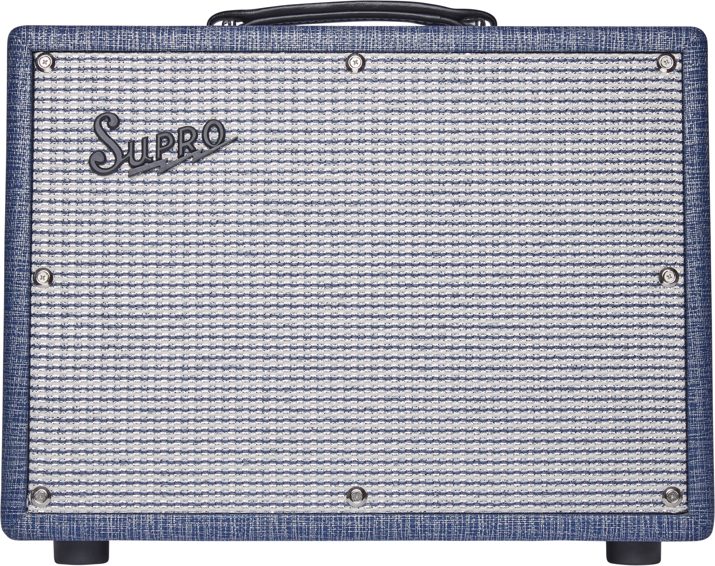 Custom Blue Rhino Hide tolex, our Supro Silver/Blue grill cloth, white piping, a dog bone handle, and engraved headplate co-branded with Supro and Keeley Electronics identities.
